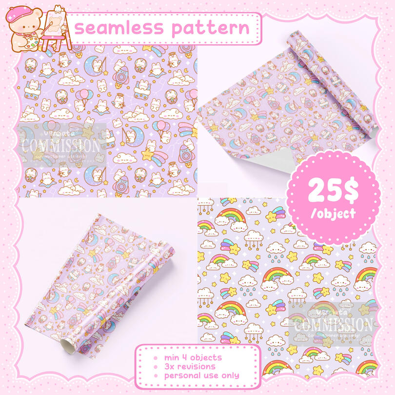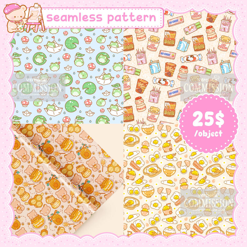 You can see my portfolio of commercial commission such as seamless patterns, brand identities, etc at my Behance page!!